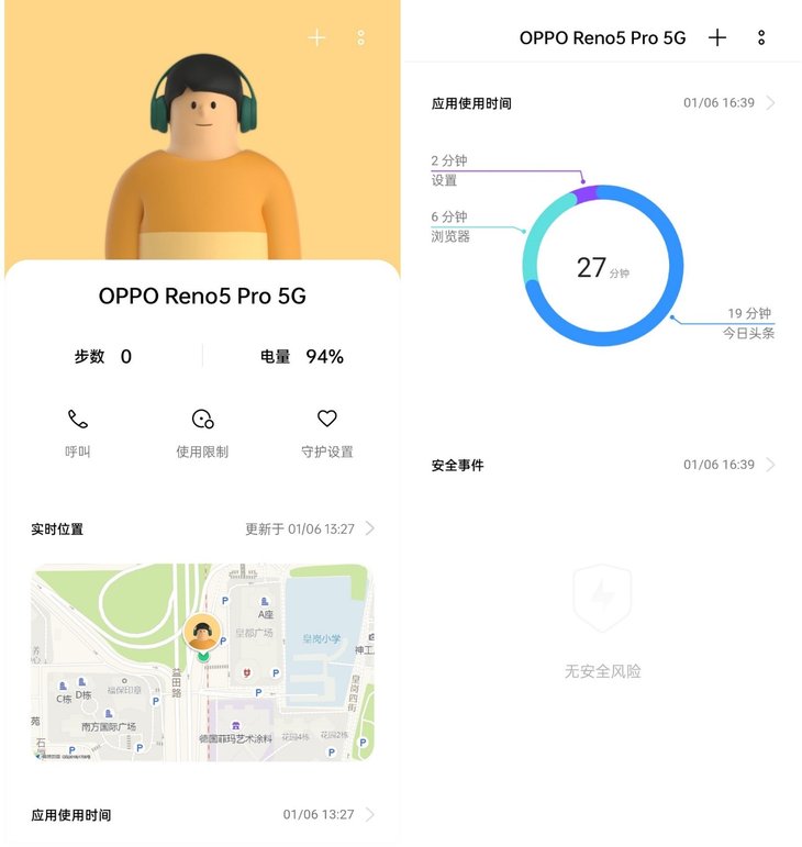 完成绑定后,打开远程守护APP就能看到被守护人手机的基本信息,包括今天走路步数、手机电量,还有就是家人的实时位置和应用使用时间、安全事件等,这些关键的信息都能在APP首页直接看到。