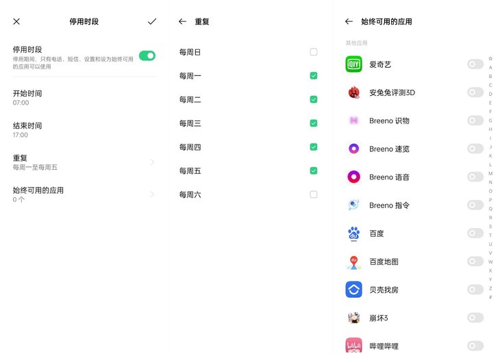 你还能够设置手机在某个时间段为停用状态,其它应用均为不可用状态,仅保留电话、短信、设置可以使用。你可以把孩子上课期间都设置为停用状态,这样就不用担心孩子上课时间玩手机,这种模式下也可以单独允许某个应用例外,可以满足不同场景的需求。