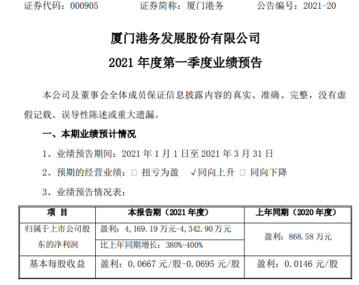 挖贝网4月9日,厦门港务(000905)近日发布2021年第一季度业绩预告,预计业绩同向上升。报告期内归属于上市公司股东的净利润4,169.19万元-4,342.90万元,比上年同期增长380%-400%;基本每股收益0.0667元/股-0.0695元/股。